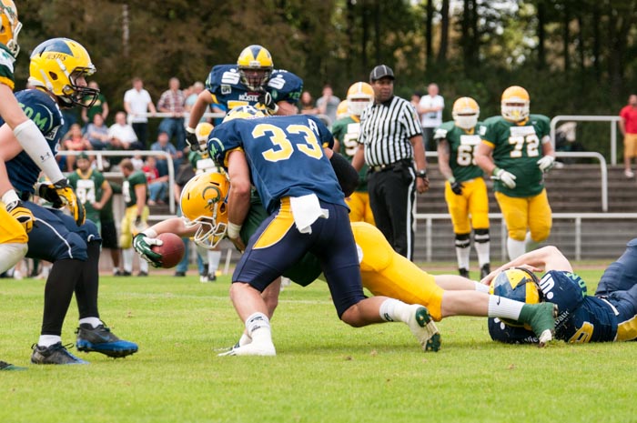 Köln. Bei perfekten äußeren Bedingungen konnten die HAisherren von Beginn des Spiels an den Gegner dominieren und schon im ersten Spielviertel 4 Touchdowns zur 28:0 Führung erzielen. Den 600 Zuschauern, unter Ihnen viele ehemalige Spieler, wurde dabei spektakulärer Football geboten, der 20 jährige QB Joao Kraphol führte seine Offense sehr überzeugend immer wieder über das Spielfeld und fand in Justin Parker früh eine Anspielstation für den ersten Touchdown. Die Defense erwischte einen super Tag und konnte Hildesheims Angriffbemühungen schnell stoppen, sodass Denis Dauben den zweiten Touchdown erzielte. Dannach begann de Show des Mike Davis. Erst konnte der Amerikaner einen langen Drive mit einem Lauf über 20 Yards zum 21:0 abschließen, nachdem dann die Defense wieder Hildesheim stoppen konnte erzielte Mike Davis durch einen perfekt ausgeführten Punt Return Touchdown das 28:0.