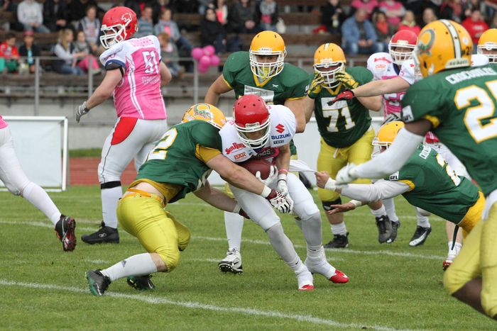 Die Cologne Crocodiles haben ihr Auswärtsspiel bei den Lübeck Cougars völlig verdient mit 46:6 verloren und müssen sich nach 3 Spielen mit dem sechsten Tabellenplatz zufriedengeben. Einige Hiobsbotschaften vor dem Spiel machten die Aufgabe für die Coaches nicht leichter. In der Offense fehlten unter anderem Stacey Bryant, Mike Davis, Denis Dauben und Max Reuter und damit einiger der Hauptleistungsträger der Offense. Bis auf Denis Dauben werden sie auch in den nächsten Wochen nicht zum Einsatz kommen können. Auch in der Defense konnte nicht aus dem Vollen geschöpft werden, beruflich- oder verletzungsbedingt fehlten hier unter anderem Chris Sliwa, Moubarak Djeri, Pascal Dauben und Nils Schaller. So machte sich die Mannschaft mit einem Rumpfkader auf den Weg nach Lübeck und kam dort aufgrund von langen Staus erst kurz vor Spielbeginn an, was auch nicht leistungsfördernd wirkte. So konnte von Beginn an die Heimmannschaft das Spiel dominieren und führte schon zur Pause mit 22:0. Ganz besonders auszeichnen konnte sich dabei Jamie Dale, der die Crocodiles immer wieder vor unlösbare Probleme stellte und alleine 3 Touchdowns selbst erzielen konnte. Auch in den Special Teams lieferte der Amerikaner eine besondere Leistung ab, er blockte einen Fieldgoal Versuch und lief 2 Punt Returns weit in die Hälfte der Gäste zurück. Erst im letzten Viertel konnten sich die Crocodiles das einzige Mal an diesem Abend auf das Scoreboard bringen, QB Joao Krapohl erlief den Touchdown zum zwischenzeitlichen 32:6. Symptomatisch war auch hier, dass der PAT nicht gut war, 3 Fieldgoalversuche der Crocodiles führten nicht zu Punkten. Headcoach Kirk Heidelberg in einer ersten Reaktion nach dem Spiel: „Die Mannschaft hat noch nicht das Potential und die Tiefe, die vielen Ausfälle zu kompensieren. In der GFL2 ist die Leistungsdichte mittlerweile so hoch, dass da einige Ausfälle direkt zu einem großen Leistungsabfall führen können. Ein Playmaker wie Jamie Dale hat heute dem Spiel der Cougars eine Dimension gegeben, die wir nicht hatten. Wir müssen hart arbeiten, um unser Spiel besser zu machen. Wir haben jetzt 2 Wochen Zeit, um uns auf das schwere Heimspiel gegen die Gamecocks aus Bonn vorzubereiten.“